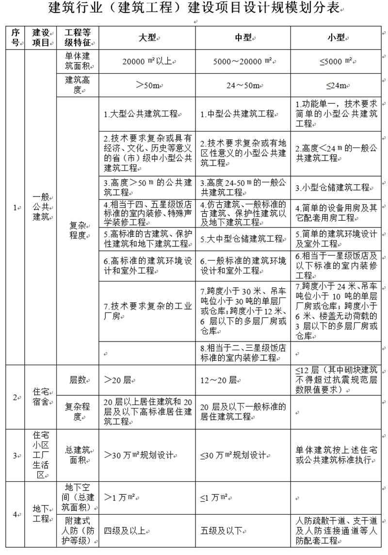 建筑行業(yè)(建筑工程)建設(shè)項目設(shè)計規(guī)模劃分表